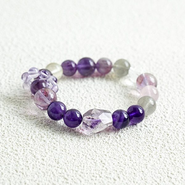 This bracelet is meticulously crafted from natural amethyst, starry rose quartz and blue moonstone, each bead imbued with nature's benevolent energy. Amethyst brings tranquillity and wisdom, while star-speckled rose quartz shimmers like hope amidst the night sky, tenderly safeguarding emotions. Blue moonstone soothes the soul. Intertwined, they seem to thread both passion and serenity into the fabric of time. Perfect for everyday wear, its simplicity radiates a subtle vitality. Whether treasured personally or gifted to another, it makes a thoughtful little present.
