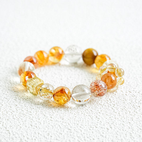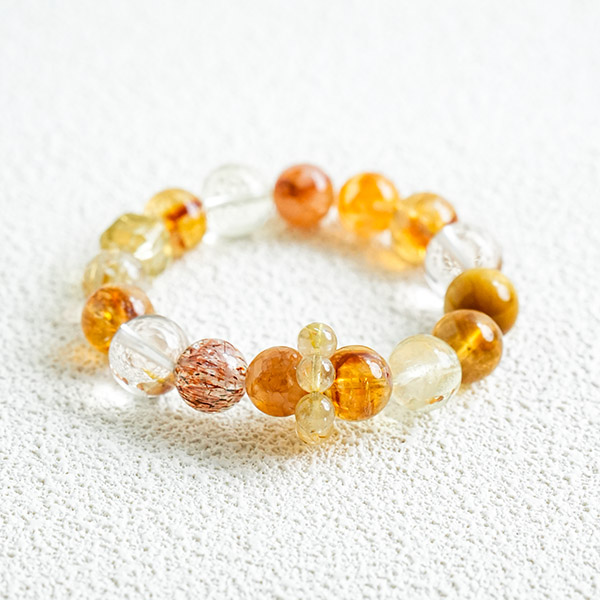 This bracelet comprises natural citrine, golden hair quartz and yellow amethyst. All three varieties are renowned for attracting wealth and enhancing fortune, often referred to as ‘stones of prosperity’. Each bead possesses unique energy and natural beauty bestowed by nature. Wearing it not only symbolises aspirations for financial abundance and career success, but also serves as an elegant adornment for the wrist, showcasing personal taste.