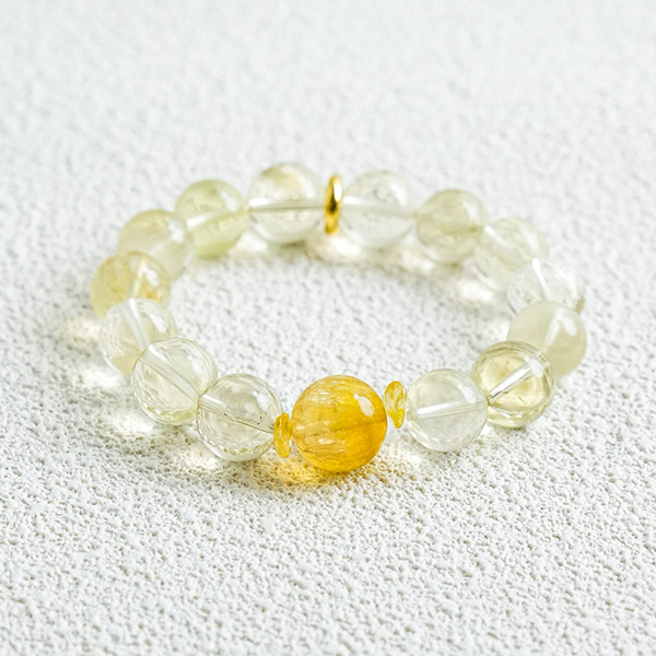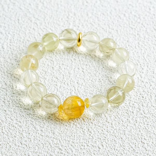 This bracelet features natural lemon-yellow citrine and fluorite. Citrine is renowned for attracting wealth and advancing one's career, helping you draw in prosperous opportunities. Fluorite purifies negative energy, alleviates stress, and brings peace of mind. The dual stones combine to both attract fortune and offer protection, making it ideal for everyday wear. Its bright, warm yellow hue is simple and versatile, infusing you with positive energy at all times. May this “auspicious” bracelet become your lucky charm, accompanying you through every day as you strive forward.