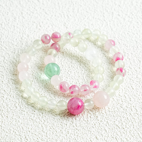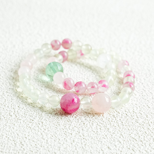This bracelet is named “Spring of Plants and Trees”, crafted from grape agate and starry pink quartz. The grape agate, a pale green hue reminiscent of spring's first buds, symbolises hope and growth. The rose quartz, a soft pink reminiscent of spring's evening glow, symbolises warmth and kindness. Together, they embody the vitality and beauty of spring, worn upon the wrist. This bracelet is both understated and imbued with energy, offering a sense of tranquillity.
